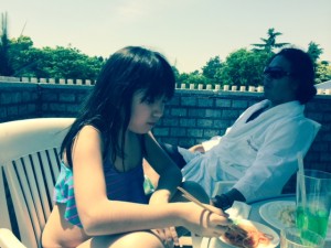 ダディなんか私たちが着替えてプールサイドに行くまでの間に、良さそうな場所を三か所押さえてたもんね。