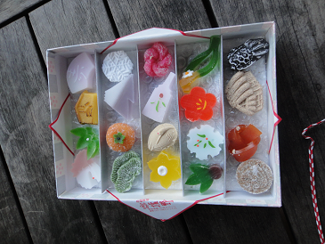 新年の旅行にはいつも「塩野」の干菓子を連れて行きます。その年の干支、富士、鶴、羽子板、寿の扇…