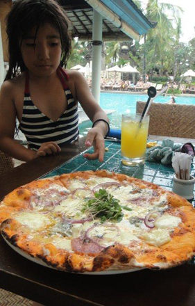 ダディが朝からサーフィンに行っている日は、母子で半日お部屋とプールでうだうだしていました。私もプール…