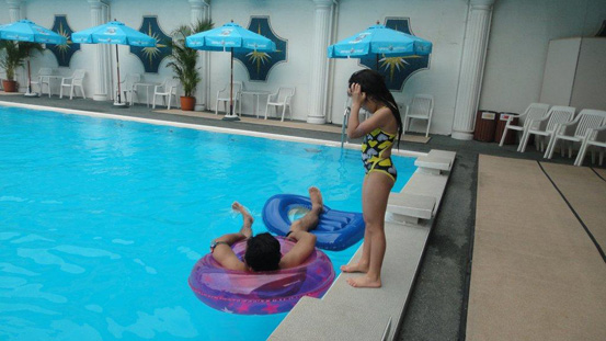 誰もいないプールで、意地でもリゾート気分のダディ。ニューオータニのプール、夏は盛り上がるけど、やっぱ…