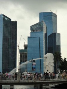 船から見たマーライオン。シンガポール観光のお土産といえば必ずついてるアレですが、富と繁栄のシンボル…