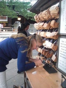 明治神宮がすっかり気に入ったアンゲリカさん、参拝後、おみくじを引き、絵馬を書き込みました。手技道も…