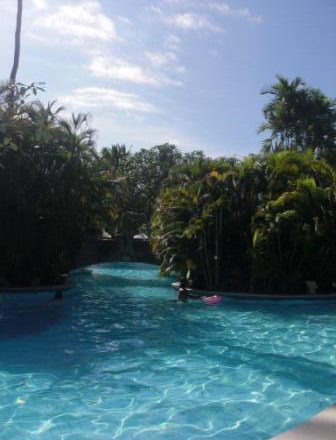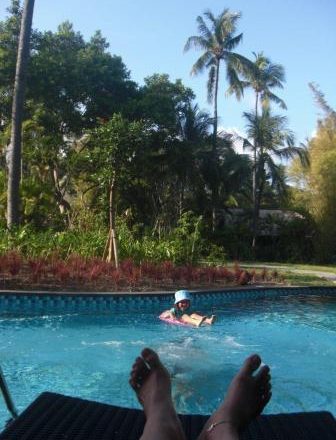 部屋に戻ると早速目の前のラグーンプールへ。「なんだよコレ、流れるプールじゃないじゃん」と文句を…
