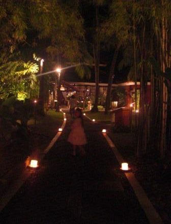 夜になるとキャンドルライトがついて、レストランまでの道を照らしますわ。それぞれのレストランには…