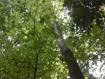 上を見上げると新緑がきれい。ちょうどこの真上に太陽が来ている時刻だったんだけど、森の木陰は涼し…
