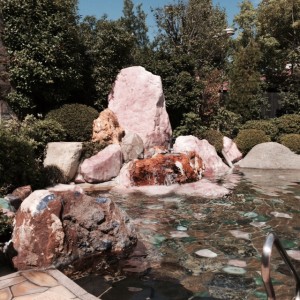 どどーんと巨大ローズクォーツがそびえる、なんと露天風呂ですわ。山梨は石和温泉にある「瑰泉」。中学の同…