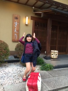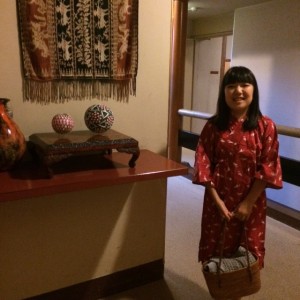 浴衣に着替えて、これから温泉に行って来てまーす。露天風呂に行くには、お庭を通って行くのだよ。錦鯉…